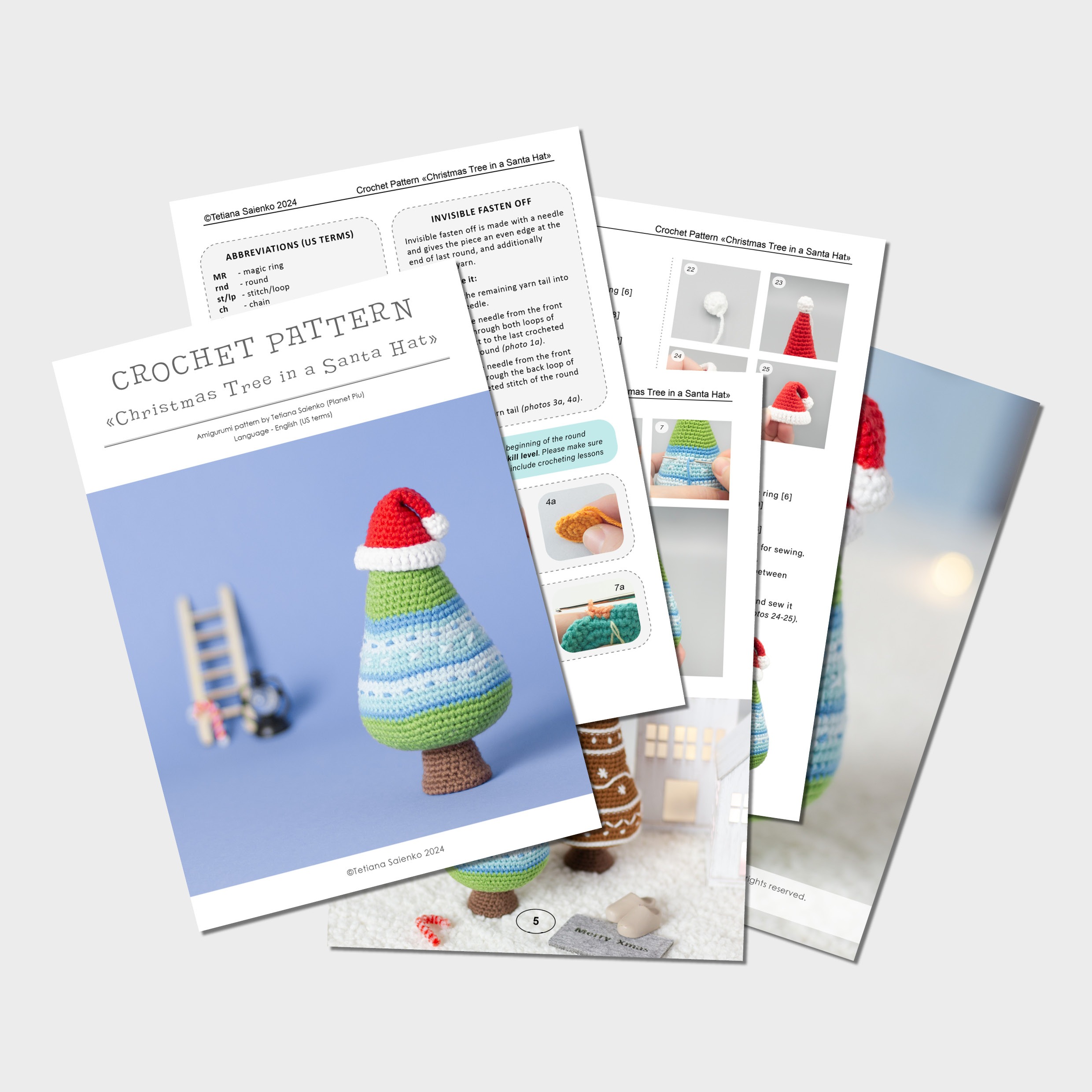 This digital amigurumi PDF pattern includes 9 pages and more than 20 photos of the detailed description of crocheting, assembly and decoration of the clothed Christmas tree.