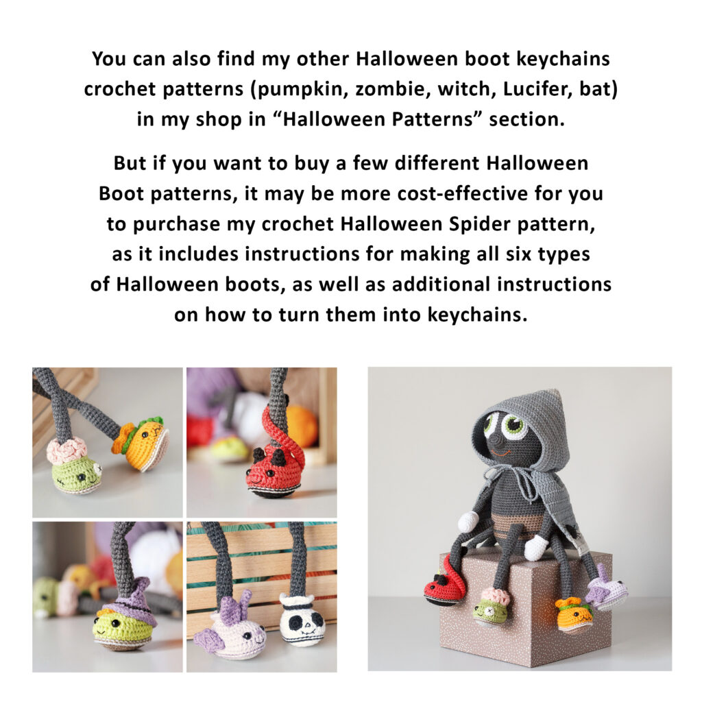 You can also find my other Halloween boot keychains crochet patterns (pumpkin, zombie, witch, Lucifer, bat) in my shop in “Halloween Patterns” category. But if you want to buy a few different Halloween Boot patterns, it may be more cost-effective for you to purchase my crochet Halloween Spider pattern, as it includes instructions for making all six types of Halloween boots, as well as additional instructions on how to turn them into keychains.