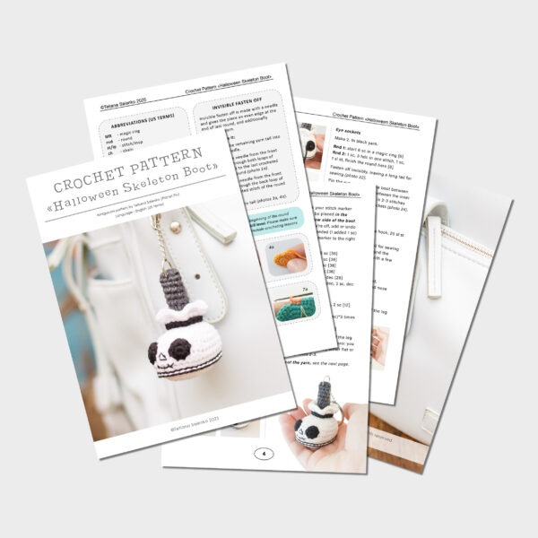 This pattern includes 9 pages and more than 30 photos of the detailed description of crocheting, assembly and decoration of the Halloween Skeleton Boot keychain.